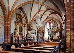Das vierjochige Langhaus hat ein Netzrippengewölbe aus der 2. Hälfte des 15. Jahrhunderts. Die Rippen der gekehlten Wandpfeiler laufen über vorgelegte Runddienste an und in runde Schlusssteine aus. Die Wandpfeiler stehen auf hohen Sockeln. Im Westjoch steht eine dreiachsige, zweijochige, spätgotische Empore über einem Kreuzrippengewölbe auf Sechseckpfeilern mit runden, skulptierten Schlusssteinen: Christuskopf, Rosetten, Bindenschild und Stadtwappen. Die Verbindung vom Langhaus zum Chor bildet ein eingezogener, im Bogenverlauf gekehlter, spitzbogiger Triumphbogen. Der zweijochige Chor mit Fünfachtelschluss ist gegenüber dem Langhaus wesentlich höher. Er hat ein Kreuzrippengewölbe mit skulptierten Schlusssteinen: das Lamm Gottes und Rosetten. Birnstabrippen laufen von den Diensten an, die in Sohlbankhöhe auf Zackenkonsolen ruhen. Im Norden des Chores ist ein spitzbogiges, gekehltes Sakristeiportal mit einem bemerkenswerten, spätgotischen Türflügel um 1500 mit filigranen, ornamentalen Schmiedeeisenbeschlägen. In den von den Eisenbändern gebildeten Rautenfeldern sind geschnittene und getriebene Ranken- und Maßwerkfüllungen über ehemals farbigem Leder eingebunden. Die Glasmalerei im Chor mit Jugendstilornamentik und der Darstellung adorierender Engel schufen 1914 Ludwig von Kurz zum Thurn und Goldenstein (Entwurf) und Ferdinand Koller (Ausführung).