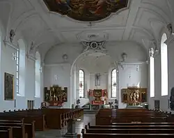 Der Kirchenraum ist im klassizistischen sogenannten „Weinbrenner-Stil“ erbaut. Die Decken wurden in den Jahren 1939 und 1940 gestaltet – mit einem großen Deckenbild im Stil und nach dem Zeitgeist der späten 30er Jahre.