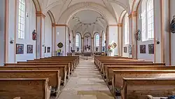 Der Pfarrer König gestaltete die Ausstattung die Kirche 1863 bis 1866 vollständig neu im romantisch-neuromanischen Stil. Pfarrer Trasberger gestaltete sie 1936 bis 1937 wiederum im neubarocken Stil.[2] Erneut umgestaltet, auch mit einem Volksaltar, wurde die Kirche 1963 nach den Erfordernissen der neuen Konzilsliturgie. Das Kreuz wurde mit drei Verbindungsseilen über dem Altar an der Decke befestigt, auf einer Querlatte am Fuß des Kreuzes stand die Kreuzigungsgruppe.[6] Von 1999 bis 2000 die von weiß „dominierte“ Wandfarbe eine „wärmere Farbgestaltung“ und das Kreuz mit Kreuzigungsgruppe kam wieder an die Wand hinter dem Altar. Seitdem besteht das Erscheinungsbild bis heute.[2]