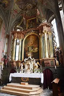 Der Hochaltar aus 1845 wurde in barocker Tradition erbaut, er zeigt das Altarblatt hl. Martin wohl von Josef Adam Mölck und im Aufsatzbild Maria Magdalena.