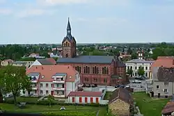 Die Kirche ist ein Bau aus Ziegelmauerwerk mit drei gleich großen Kirchenschiffen mit jeweils eigenen Satteldächern. An der Ostwand wird der Bau durch eine halbrunde Mittelapsis abgeschlossen, flankiert wird diese von eingeschossigen Anbauten mit weiteren Apsiden. Der Westturm ist stark in das mittlere Schiff eingerückt und hat ein Faltdach mit oktogonaler Laterne und Spitzhelm. Im Westen befinden sich drei Rundbogenportale. Die Fenster an den Längsseiten sind zweizonig angeordnet; unten paarig und die größeren oberen Fenster in Dreiergruppen. Die Fassade ist mit Bändern aus gelben Ziegeln und mit Lisenen und Gesimsen gegliedert.[2]
