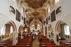 Der Kircheninnenraum ist mit farbenfrohen Deckenfresken und Wandbildern, opulenten Stuckarbeiten, zahlreichen Putten und Heiligenfiguren ausgestattet. Die Stuckaturen im Langschiff sind Arbeiten von dem gebürtigen Wessobrunner Johann Georg Graf und im Chorraum von dem aus Schnifis / Vorarlberg stammenden 21-jährigen Johann Jakob Schwarzmann, die Ausmalung erfolgte durch Meinrad von der Au (von Ow), dem Sigmaringer Hofmaler.