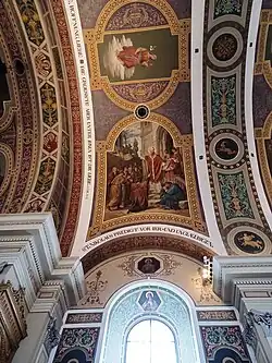 Die Gewölbefelder, die Gurte, die Fensterleibungen und die seitlichen Wandflächen sind mit Fresken ausgestattet. Von 1874 bis zu seinem Tod 1881 erarbeitete der Kirchenmaler Georg Mader die Fresken. Ein paar Details waren bei seinem Ableben noch nicht fertig, diese vollendeten im Jahr 1882 Albert von Felsenburg und Franz Rubensteiner. Die Ornamente zwischen den Bildern sind von Joseph Thurner. Die Bilder sind charakteristisch für das 19. Jahrhundert und sind der Kunst der Nazarener zuzuordnen.[6]