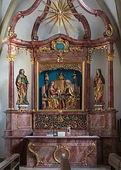In der Kirche befinden sich mehrere barocke Altäre: Der Hauptaltar im Chor zeigt Nikolaus von Myra, der als Symbol drei goldene Äpfel trägt, flankiert von Papst Urban I. mit Trauben und Bischof Blasius von Sebaste mit einer Kerze. Die Nebenaltäre sind Maria und Josef geweiht. Haupt- und Nebenaltäre sind aus Holz und marmoriert angemalt.
