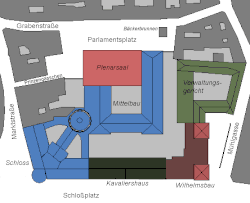 Der Gebäudekomplex von Stadtschloss und angrenzenden Gebäuden im Überblick: die farblich hervorgehobenen Gebäude sind Teil des Hessischen Landtags. Am Schlossplatz (unten) von links nach rechts: Stadtschloss (blau), Kavaliershaus (dunkelgrün), Wilhelmsbau (dunkelrot); rückwärtig: Mittelbau des Schlosses (blau) und Plenarsaal (rot). Das Gebäude des ehemaligen Verwaltungsgerichts (grün) steht ebenfalls dem Landtag zur Verfügung.
