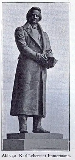 In zwei Nischen der Vorderfassade wurden 1901 zwei Bronzestandbilder angebracht, die von Professor Clemens Buscher im Auftrag des Kunstvereins für Rheinland und Westfalen modelliert wurden. Die eine Figur stellt Karl Immermann dar, welcher von 1834 bis 1837 Leiter des Hauses am Marktplatz war und ihm als Immermann’sche Musterbühne Vorbildcharakter verliehen hatte. Die andere stellt Felix Mendelssohn Bartholdy dar, der als ein Zeitgenosse Immermanns das Düsseldorfer Musikleben entscheidend bereicherte. Das Bildnis des Komponisten wurde nach 1936 wegen seiner jüdischen Herkunft entfernt und 1940 eingeschmolzen. Das Immermann-Denkmal wurde im März 1940 an der Goltsteinparterre im Hofgarten aufgestellt. Eine Rekonstruktion des Mendelssohn-Denkmals wurde in 2012 an der Südseite des Hofgartens neben der Deutschen Oper am Rhein wiedererrichtet.