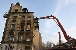 Eine kritische Diskussion im Rahmen des Stadtumbaus gab es in einigen Städten mit betroffenen, größeren, gründerzeitlichen Stadtteilen oder Stadtquartieren, vor allem aus der Perspektive des Denkmalschutzes. Laut einer Studie der Bundestransferstelle Stadtumbau Ost liegen räumliche Rückbauschwerpunkte zwar in 90 Prozent der ostdeutschen Kommunen in Wohnungsbeständen aus der Zeit der DDR, in fast jeder fünften Kommune gibt es aber weitere Schwerpunkte in den Gründerzeit­quartieren, in jeder siebenten in historischen Altstädten. Etwa jede zehnte abgerissene Wohnung in den neuen Bundesländern ist dem Altbau­bestand zuzurechnen, 80 Prozent dieser Abrisse werden durch das Programm Stadtumbau Ost gefördert. Bei Bürgern erwecke „der Abriss im Altbaubestand ungute Erinnerungen an politisch und planerisch motivierte Flächensanierungen in Ost- und Westdeutschland“. Es wird die Gefahr gesehen, dass ostdeutsche Städte durch die Sanierungsmaßnahmen mit der vielfach noch bestehenden Bausubstanz ein wichtiges Alleinstellungsmerkmal verlieren könnten.[2] Um das zu verhindern, wurde ab 2007 der Rückbau von Gebäuden, die vor 1919 errichtet wurden, von der Förderung ausgeschlossen.[3]