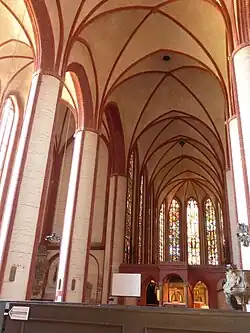 - Im Unterschied zur klassischen Hallenkirche ragt das Mittelschiff des Langhauses etwas höher empor als die Seitenschiffe.
