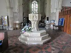 Bemerkenswert ist das große Taufbecken aus dem Ende des 15. Jahrhunderts. Es steht auf einem stattlichen Sockel, der reliefartig verziert ist. Die sechs Reliefs stellen Apostel und eine seltene Szene der Heiligen Dreifaltigkeit dar. Das westlichste Relief zeigt die Taufe Christi, die von einem Engel beobachtet wird. Die Darstellungen der Dreifaltigkeit als menschliche Figuren waren in der anglikanischen Reformatoren des 16. Jahrhunderts nicht angängig. So wurde das Taufbecken, wie an vielen anderen Orten auch, verputzt, um die Darstellungen zu verbergen. Bei der Restaurierung um das Jahr 1850 erschienen sie unversehrt wieder.