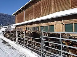 In der Schweiz bezeichnet der Stall auch Wirtschaftsgebäude, welche zur kombinierten Unterbringung von Tieren und z. B. Heu gebaut wurden, respektive gar einzig der Aufbewahrung des Letzteren dienen („Heustall“).[1] Für die Innenhaltung von Tieren müssen Ställe hinsichtlich Lufttemperatur, relativer Luftfeuchtigkeit, Luftgeschwindigkeit und Schadgaskonzentrationen bestimmte Mindestnormen erfüllen. Diese als Stallklima bezeichneten Umgebungsbedingungen unterscheiden sich nach Tierart und Nutzungsrichtung.
