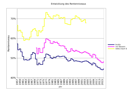 Das Standardrentenniveau hat sich seit der Einführung der dynamischen gesetzlichen Rente 1957 sehr unterschiedlich entwickelt. Seit den siebziger Jahren sinkt das Niveau „vor Steuern“ kontinuierlich. Im Jahr 2002 lag das Bruttoniveau bei 48,3 %, das Nettoniveau vor Steuern bei 52,9 %. Das Standardrentenniveau liegt nach Schätzung der Deutsche Rentenversicherung Bund im Januar 2018 in bei 45,0 % (Bruttostandardrentenniveau) und bei 48,1 % („vor Steuern“).