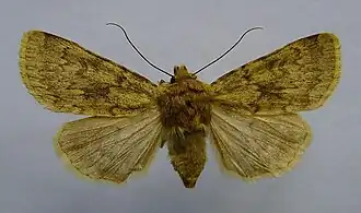 Die Flügelspannweite der Falter beträgt 35 bis 44 Millimeter[2] (35 bis 40 mm[1]). Die Grundfarbe der Vorderflügeloberseite variiert von hellcremefarben über gelbbraun, gelbgrau bis grau. Frische Falter sind oft gelb (oder „goldfarben“) überstäubt. Die dunkleren Quer- und Wellenlinien heben sich deutlich ab und sind stark gezackt. Zapfen-, Ring- und Nierenmakel sind etwas verdunkelt, gelegentlich ist die Ringmakel aber undeutlich oder verwaschen, auch fehlend. Alle drei Flügelfelder (Basal-, Mittel- und Saumfeld) können schwache schattierende Querbinden aufweisen; diese können aber auch fehlen[3]. Die Fransen sind gelblich, oft gescheckt. Die Hinterflügel sind einfarbig gelbbraun, oft mit einer etwas dunkleren Randbinde bzw. der Flügel hellt sich zum Flügelansatz hin etwas auf. Die Unterseiten der Vorderflügel sind gelblich gefärbt, die Unterseiten der Hinterflügel sind dunkelgrau gefärbt; sie werden zum Apex hin gelblich. Der Diskalfleck auf den Unterseiten von Hinter- und Vorderflügel ist jeweils halbmondförmig und mehr oder weniger verwaschen.