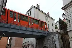 Wagen der Linie F2 (Saint-Jean–Fourvière) über der Rue Tramassac