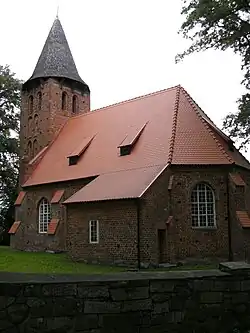 Die Kirche mit Westturm und beidseitigen Anbauten ist ein Ziegelbau und stammt aus gotischer Zeit um 1400. Der Altartisch ist aufgemauert und stammt aus der Zeit um 1700.[10] Der Hauptteil ist ein geschnitztes Abendmahlsbild, von vier Säulen eingeschlossen, zwischen denen Petrus und Paulus sowie Adam und Eva dargestellt sind. Die Orgel stammt von Christian Friedrich Völkner aus Dünnow (Duninowo) bei Stolpmünde (Ustka) und wurde 1870 erbaut.