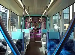 Die vollklimatisierten Fahrzeuge haben eine Länge von 45,4 Metern und eine Breite von 2,65 Metern und bieten 450 Fahrgästen Platz.[37] Der Zu- und Ausstieg erfolgt über acht gleichmäßig verteilte Fahrgast-Doppeltüren je Seite.[38] Bei Bedarf können die Urbos 3 durch zwei zusätzliche Segmente weiter verlängert werden.[39]