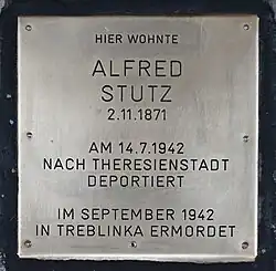 Alfred Stutz wurde am 2. November 1871 geboren. Er musste seine Wohnung verlassen und in eine Sammelwohnung in der Rembrandstraße 13 in der Leopoldstadt übersiedeln, wurde am 14. Juli 1942 ins Ghetto Theresienstadt deportiert und im September 1942 im Vernichtungslager Treblinka vom NS-Regime ermordet.