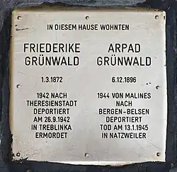 Friederike Grünwald Friederike Grünwald wurde am 1. März 1872 in Wien geboren. Am 20. August 1942 wurde sie von dort aus ins Ghetto Theresienstadt deportiert. Am 26. September 1942 wurde sie ins Vernichtungslager Treblinka deportiert und dort ermordet.[3][4]
