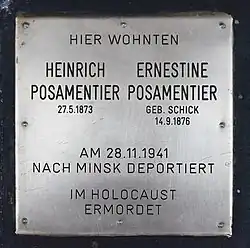 Heinrich Posamentier Heinrich Posamentier wurde am 27. Mai 1873 in Wien geboren. Seine Eltern waren Samuel Posamentier (1835–1901) und Charlotte geb. Broch oder Bree (1838–1899). Er hatte drei Schwestern und einen Bruder, der bereits als Kleinkind verstarb.[16] Er heiratete Ernestine geb. Schick. Das Paar hatte zumindest zwei Kinder, Tochter Charlotte und Sohn Ernest. Am 28. November 1941 wurde das betagte Ehepaar verhaftet und mit Transport 12 ins Ghetto Minsk deportiert. Seine Transportnummer war 140. Dort wurden Heinrich Posamentier und seine Ehefrau vom NS-Regime ermordet.[17][18]