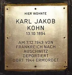 Karl Jakob Kohn wurde am 13. Oktober 1894 in Stanislau in der heutigen Ukraine geboren. Er wurde am 7. Dezember 1943 von Frankreich ins KZ Auschwitz deportiert und dort 1944 vom NS-Regime ermordet.