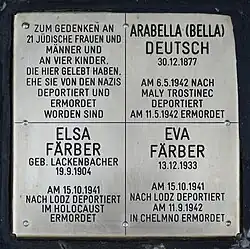 • Anna Maria Rosenfeld, geboren am 28. Dezember 1867, deportiert am 19. Oktober 1941 ins Ghetto Litzmannstadt und dort ermordet am 13. April 1942
