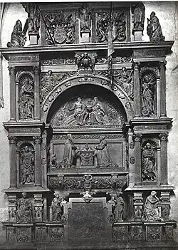 - ↑ Baresel-Brand, S. 144: „Deren beide untersten Ädikulen mit großen Wappendarstellungen, geschieden durch drei Karyatiden, werden außerdem von zwei knienden Figuren flankiert, von denen eine möglicherweise ein Moses ist […]“
