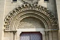 An der Westfassade befindet sich das romanische, von Archivolten gerahmte Hauptportal. Es wird seitlich von zwei mächtigen Strebepfeilern eingefasst. Das Tympanon ist in kleine Quadrate eingeteilt, deren Flächen mit Sternen gefüllt sind. Darüber wölben sich mit Rundstäben verzierte Archivolten. Diese werden von einem Band gerahmt, dessen Dekor aus zwei Reihen kreisrunder, von feinen Linien umschlungenen Öffnungen besteht. In den äußeren Bogen sind ebenfalls feine Linien geritzt, die in Kragsteinen mit skulptierten Köpfen münden. Über dem Portal öffnen sich zwei schmale Rundbogenfenster und in der Mitte ein von profilierten Schmuckrahmen eingefasstes Rundfenster, an dem seitlich und unten zwei kleine Figuren angebracht sind.