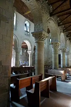 Das dreischiffige Langhaus ist in fünf Joche gegliedert. Einfach gestufte Rundbogenarkaden auf kräftigen Säulen trennen das Hauptschiff von den beiden Seitenschiffen. Die romanischen Kapitelle der Säulen sind wuchtig und mit schlichten geometrischen Motiven verziert. Das Mittelschiff ist auf beiden Seiten von fünf Rundbogenfenstern durchbrochen. Der Chor ist rechteckig geschlossen und wird von gotischen Maßwerkfenstern durchbrochen.
