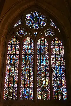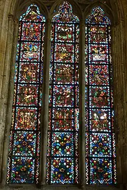 Das zentrale Chorfenster besteht aus vier Lanzetten mit je sechs Medaillons, auf denen Szenen der Passion und der Auferstehung Christi dargestellt sind. Auf dem Sechspassfenster des Bogenfeldes thront eine Majestas Domini. Das Fenster aus dem 13. Jahrhundert wurde mehrmals aus- und wieder eingebaut, wobei die Anordnung der einzelnen Szenen verändert wurde.