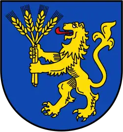 Blasonierung: „Das Wappen der Gemeinde Stedesdorf stellt auf blauem Grund einen goldenen (gelben) Löwen mit roter Zunge dar, der in seinen Tatzen vier goldene (gelbe) Kornähren hält.“[11] |