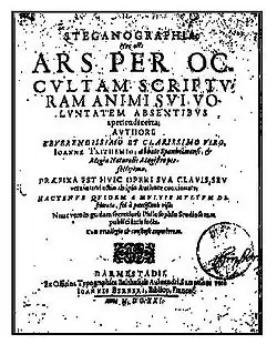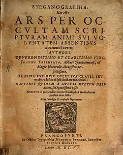 - ↑ Anton Walder: Johannes Trithemius – Ein Pionier der Krytologie. In: Klaus Arnold, Franz Fuchs (Hrsg.): Johannes Trithemius (1462–1516). Abt und Büchersammler, Humanist und Geschichtsschreiber (= Publikationen aus dem Kolleg „Mittelalter und Frühe Neuzeit“ Bd. 4). Königshausen & Neumann, Würzburg 2019, ISBN 978-3-8260-6904-8. S. 179.