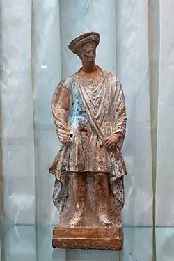 Die Statuette stellt einen auf einer zweistufigen Basis stehenden jungen Mann dar. Er ist mit gegürtetem Chiton und Himation bekleidet. Mit beiden Händen hält er den elegant umgeworfenen Stoff. Der Kopf ist mit einer Wulstbinde umbunden und mit einer niedrigen runden Hutkappe bedeckt. Die rechte Hand ist eingehüllt. In dieser Hand hat er vermutlich einen Stock gehalten, wie wir aus dem runden Bohrloch annehmen dürfen. Die aus rotbraunem Ton gebrannte Statuette misst in der Höhe 30,7 cm und stammt aus Böotien.