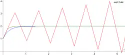 Diese liefern aber nur dann brauchbare Werte, wenn der Betrag des Vorfaktors von kleiner eins ist, , hier also für . Für liegt dagegen das Produkt außerhalb des Stabilitätsgebiets, das bei endet, siehe Eulersches Polygonzugverfahren#Eigenschaften. Für solche, zu großen Schrittweiten wachsen die Lösungen unbegrenzt an, vgl. Grafik.