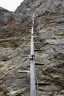 Eskaladieren (Eskalade, frz.: escalader, escalade), bedeutet mittels Sturmleitern ersteigen[2], also die Ersteigung von Mauern oder steilen Böschungen. Dieses Gerät war ein wichtiges mittelalterliches Kriegsgerät. Häufig einholmig mit an der Spitze angebrachten Haken war es leicht und gut zu handhaben. So sollten die Sturmkolonnen den Wall der Burg oder Festung auf Sturmleitern ersteigen, versuchen sich dort festzusetzen und das Tor von innen öffnen, um den Reserven den Weg frei zu machen.