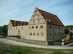 • Außer der Kirche befindet sich auf dem Schlossberg auch das Dalbergsche Landhaus, ein repräsentativer Wohnbau der einstigen Ortsherrschaft, der als Oberes Schloss einst auch von den Grafen von Wiser und den Grafen von Westerholt bewohnt wurde.