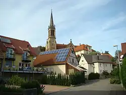 • Die Pfarrkirche Heilig Kreuz wurde 1881 bis 1884 im Stil der Neogotik nach Plänen von Ludwig Maier auf dem Schlossberg an Stelle der früheren Burg erbaut. Vorgängerbau der Kirche war die ursprünglich aus dem 11. Jahrhundert stammende Burgkapelle, die 1501 von Philipp von Weinsberg und 1725 unter von Dalberg erneuert wurde und 1835 in den Besitz der Gemeinde kam. Die Kirche wurde 1987 bis 1994 umfassend renoviert.