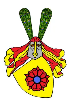 In Gold eine rote Rose mit blauen Butzen. Im 14. Jahrhundert von einigen Mitgliedern mit fünflätzigem blauen Turnierkragen vermehrt. Der Helm, mit rot-goldenen Decken, war seit 1352 mit zwei Pfauenwedeln besteckt. Ab 1400 zierte den Helm ein gelber Hunderumpf mit rotem Halsband. Aus dem Hund wurde später ein silberner Esel mit schwarzer Krone um den Hals. Die Helmdecken sind Schwarz-Silber. Das Wappen wurde gebessert und später mit dem der ausgestorbenen Familie Schöneck vereint.