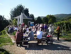 Wenige Meter vom Eingangstor entfernt befindet sich das Schwarze Häuschen, das von April bis Oktober freitags bis sonntags als Ausschank dient. Von den Tischen und Bänken im Freien hat man einen weiten Blick über den Rhein bis nach Rheinhessen.