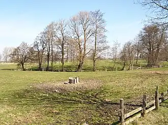 - Im Innern umschloss ein 8,5 bis 16 m breiter Graben den alten Burgplatz, der ein abgerundetes Quadrat von 70 bis 75 m bildete und auf dem der Pulverturm stand. Eine Brücke führte über den südlichen Grabenabschnitt.