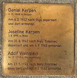 | Josefine Kerpen | Josefine, Daniels Tochter, wurde nach der Zwangsumsiedelung nach Wien nach Maly Trostinec deportiert. Sie wurde im Holocaust ermordet[9] | |||