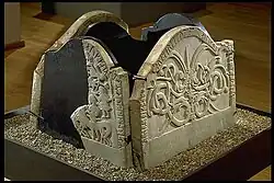 Eindeutig christlich sind die beiden leicht beschädigten, im gekonnten Urnes-Stil dekorierten Kistensteine, die zu einer Grabkiste gehören und ins 11. oder 12. Jahrhundert datiert werden. Der eine zeigt ein Ranken- und Schlangen-Ornament, der andere den Hl. Christophorus mit dem Christuskind auf dem Rücken, wie er über Drachen und Ungeheuer schreitet, die das Heidentum symbolisieren. Die noch recht deutlich erhaltenen Farbspuren machten eine Rekonstruktion der Bemalung möglich. Die Runeninschrift lautet: „Söhne Liknats (ließen machen) ein schönes Denkmal für Ailika, die gute Ehefrau, Mutter. (Gottes und der Gottesmutter Gnade) für sie und die, welche das Denkmal machten (das größte, das) Menschen sehen werden“.