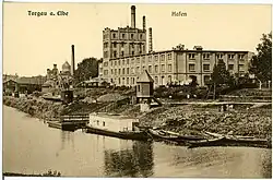 Die Marmeladenfabrik Leue & Weise an der Hafenstraße 2 wurde um 1900 errichtet. Das Fabrikgebäude hat eine gelbe Klinkerfassade, der seitliche Turmanbau ist weithin sichtbar. 1911 wurde die Fabrik zur Glockengießerei unter dem Namen AG Lauchhammer Torgau umfunktioniert und 1926 von Villeroy & Boch übernommen.[12] Zum Fabrikkomplex gehört ein eigener Hafen an der Elbe.[13] Das Grundstück war gut 17.000 m² groß, der Kaufpreis einschließlich Gebäude und Einrichtungen betrug 160.000 RM.[2]