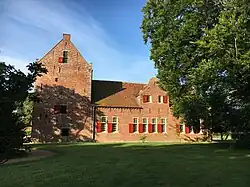 Der barocke Westanbau ist über einem Grundriss von 20,1 × 11,4 m errichtet. Er ist nicht durch einen Mauerwerksverband mit dem Turm verbunden und weist auch keine doppelte Abschlussmauer zum Turm auf, sondern wurde direkt angemauert. Aufgrund der Neigung des Turms wurde die senkrechte Fuge im Laufe der Zeit immer größer und weist in Höhe der Traufe eine Breite von 20 cm auf.[20] Über jedem rechteckigen Fenster (65 × 123 cm) ist ein kleineres (65 × 97 cm) angebracht, die durch ein Sandsteinelement verbunden werden. Die Fensterstürze und Sohlbänke sind ebenfalls aus Sandstein gefertigt. Die Außenwände werden unter der Traufe mit einem Fries angeschlossen. An der Nord- und Südseite befindet sich je ein Zwerchhaus mit Satteldach und einem geschwungenen Giebel. Während das nördliche Zwerchhaus zwei rechteckige Fenster aufweist, ist das südliche aufwändiger gestaltet: Über einem großen Fenster mit Segmentbogen, das auf eine Vergrößerung im Jahr 1751 zurückgeht, ist ein Sandsteinband eingemauert und in der Giebelspitze ein kleines Rundfenster. Die Eckpilaster sind mit Sandstein verziert. Das Eingangsportal weist ebenfalls einen Segmentbogen auf, über dem das Wappen der Familie van Heteren zu sehen ist, und wird seitlich von zwei schmalen Doppelfenstern und Pilastern flankiert. Zum Osten hin beim Turm ermöglicht ein kleiner Vorbau einen Nebeneingang.