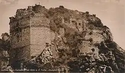 Die Burgruine Steinkallenfels wurde 1212 erstmals urkundlich erwähnt und war ursprünglich Reichslehen der Herren von Stein, später Herren von Steinkallenfels genannt (ausgestorben 1778). Bereits 1150 und 1158 wird ein Hugo von Stein erwähnt, der sich vielleicht nach der Burg nennt. Seit dem 14. Jahrhundert war sie Ganerbenburg. In einem Burgfriedensvertrag von 1371 werden 25 Mitbesitzer genannt, die Anteile an der Burg hatten, aber vermutlich nicht alle dort wohnten. 1523 wurde die Burg im Ritterkrieg erobert.[1] 1615 wurde die Burg bereits als baufällig bezeichnet. Schließlich wurde sie 1682/84 von den Franzosen gesprengt und ist seither Ruine.