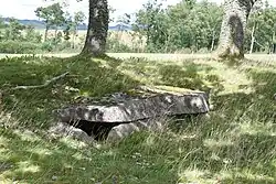 Die Nordwest-Südost orientierte Steinkiste (schwedisch Hällkiste) liegt im südöstlichen Teil eines baumbestandenen Hügels und misst etwa 2,8 × 1,0 m. An der einen Langseite liegen zwei Platten von 0,8–1,7 m Länge, 0,6–0,7 m Höhe und 0,1–0,2 m Dicke. Die andere Langseite besteht aus drei Platten von 0,55 bis 1,3 m Länge, 0,5 bis 0,6 m Höhe und 0,1 bis 0,5 m Dicke. Die kurzen Endseiten bestehen aus 0,2 m dicken Platten. Der Deckstein ist 2,6 m lang, 1,2 m breit und 0,25 m dick. Unmittelbar südwestlich der Steinkiste liegt ein Stein von 0,6 × 0,4 m.