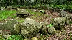 Die Steinkiste liegt exzentrisch in einer runden Steinsetzung von 8,5 m Durchmesser, unter dem ehemaligen Hügel. Die Steinsetzung besitzt noch einen konzentrischen inneren Kranz aus kopfgroßen Steinen. Sie war von einer Rollsteinpackung bedeckt, die sich über den äußeren Steinkranz hinweg zog, der offensichtlich nur der Hügelstabilisierung diente. Die Kiste besteht aus fünf plattenartigen Seitensteinen und dem monolithischen Deckstein. Sie ist 1,45 m lang, 0,94 m breit und 0,52 m hoch. Den Boden bildete hauptsächlich eine 1,10 × 0,6 m große Steinplatte. Das sorgfältig verschlossene Innere erwies sich während der Ausgrabung als ungestört. Bis auf einen Hohlraum im oberen Drittel war die Kiste mit Sand gefüllt.