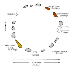 Diese Steinkreise, von denen ein Großteil gut erhalten ist, bestehen aus einer ungeraden Anzahl von aufrecht stehenden Steinen. In der Mehrzahl der Fälle handelt es sich um fünf Steine, es wurde jedoch in vielen Fällen auch Anzahlen von sieben bis 19 Steinen gefunden. Sie sind symmetrisch so arrangiert, dass ein meist besonders kenntlicher Stein direkt gegenüber zwei Steinen liegt, die normalerweise die höchsten im Kreis sind und eine Art von Zugang markieren (Steinkreis von Bohonagh). Es ergibt sich dadurch eine Achse zwischen den beiden Orthostaten des Eingangs hindurch zu dem als „axialer Stein“ (axial stone)[1] oder „liegender Stein“ (recumbent stone) bezeichneten Stein, der konstant im südwestlichen Sektor der Denkmäler liegt. Die Orientierung legt eine Verwendung der Steinkreise zu astronomischen Berechnungen nahe. Typisch, aber nicht durchgängig ist, dass sich die Höhe der Steine im Kreis in Richtung auf den axialen Stein reduziert. An einigen Kreisen wurde Leichenbrand in kleinen, ungekennzeichneten Gruben entdeckt, so bei Drombeg in Westcork.