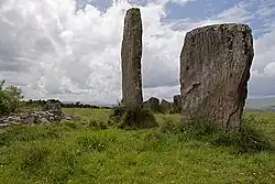 - Zum Kreis gehören zwei in der Nähe aufgestellte Menhire, von denen einer eine Resthöhe von über vier Metern aufweist. Ursprünglich war er über sechs Meter hoch. Wie die meisten außenstehenden Menhire (englisch outlier) liegen sie auf der Nordost-Südwest-Achse, auf die auch der Kreis mit seinem „axialen Stein“ und dem Portal ausgerichtet ist.