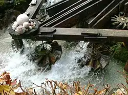 Damit sich die schweren Kugeln kontinuierlich drehen, sowie mit Wasser benetzt sind, werden in die Brunnenbecken eine oder zwei Düsen eingebaut.[6] Beim Einbau von zwei Düsen wird durch eine Schaltung gewährleistet, dass im Wechsel aus nur einer Düse Wasser austritt und auf die Kugel trifft und sie dadurch bewegt. Wird nur eine Düse eingebaut, wird die Rotation durch eine nicht kontinuierliche Schaltung eines schräg gerichteten Wasserstrahls ausgelöst. Sobald Wasser fließt, bewegt sich die Kugel und durch die Drehung mit den beiden oben genannten patentierten Methoden ist sie permanent ganz mit Wasser benetzt.