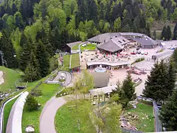 ![]() Hauptgebäude mit Eingang, Bahnen und Restaurant. Blick von der Seilbrücke. (2004) | ||||