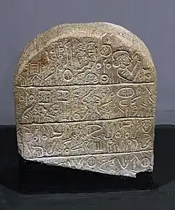 Die Stele ist oben abgerundet und hat erhaltene Maße von 0,50 Meter in der Höhe, 0,45 Meter in der Breite und eine Tiefe von 0,20 Meter. Die Schrift ist eingraviert, der Erhaltungszustand gut. Es ist der obere Teil einer höheren Stele, wobei drei Zeilen der Inschrift und Reste der vierten Zeile erhalten sind. Sie ist an allen Seiten beschrieben einschließlich der Oberseite. Der Text beginnt auf der Vorderseite (A) rechts oben, verläuft nach links und weiter über die Seiten B (links), C (Rückseite) und D (rechts) und boustrophedon über alle Seiten. Die zweizeilige Inschrift auf der Oberseite ist unabhängig vom Rest. Sie beginnt neben einem Trennstrich in der Mitte, verläuft nach links, danach auf der unteren Zeile nach rechts und wird in der rechten Hälfte der oberen Zeile linksläufig beendet.